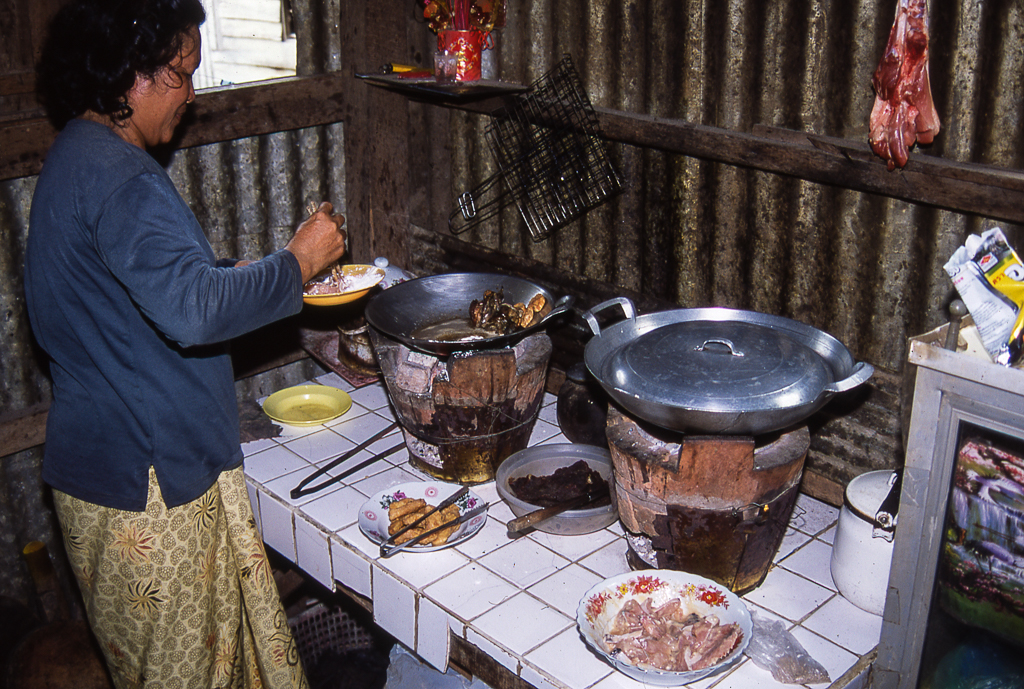 Sisaphon, Cambodia. August 2003. This two-stove white-tile kitchen is in the home of Master Performer Nong Chok, an opera singer and teacher who survived the Khmer Rouge. His wife cooks up a special meal in the well ventilated rear room of the house. The 3-point bucket stove is the most common cooking device in urban homes. Perfect for a wok or a pot of rice, its fuel – charcoal or wood – is added through an opening at the base.